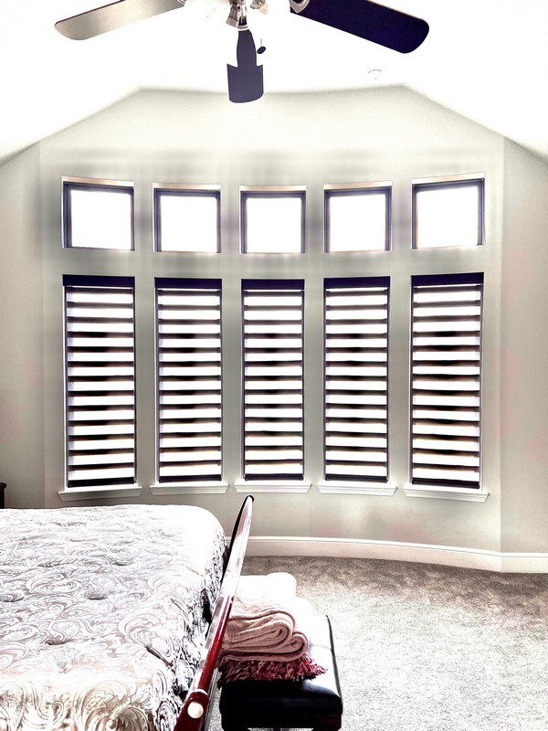 "Zebra" shades are what everyone calls them. These are motorized Norman Perfect Sheer Shades in a room-darkening fabric. With the push of a button, the shades slide up into the head rail and disappear. The customer wanted privacy on the lake but also wanted a full view of the lake during the day. This was a fine solution.