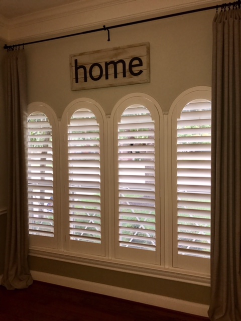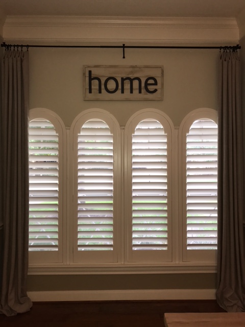 My customer had no idea what she wanted for these windows. With the size of the windows and the arched tops, we were limited. We suggested the 3 1/2" Norman Wood shutters with hidden tilt. They turned out BEAUTIFUL! The customer was extremely happy with the finished product. When you want the best for your windows, look no further than JC's Window Treatments!