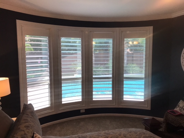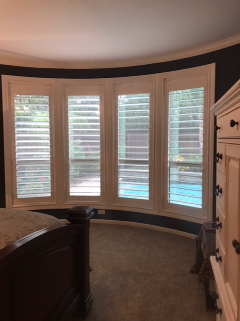 These wood plantation shutters add drama to an already beautiful master bedroom. The 4 1/2" louvers provide a nice open view of the pool and backyard when open while blocking out most of the light when closed as well as providing total privacy.